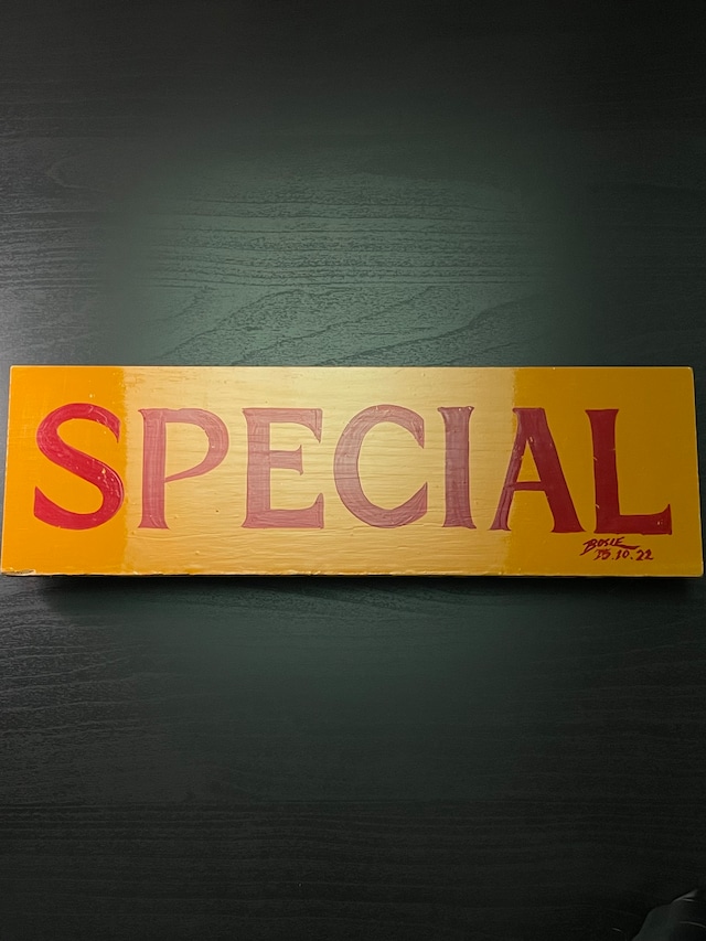 2015年10月22日、BRUSH DESIGNの筆跡が「作品」として残された初期アーカイブ。 SPECIALという言葉を、ただのタイポグラフィではなく、 「手描き」という行為そのもので表現したピースです。 余った塗料を使い、下書きもなく、バランスさえ気にせずラフに描いたその筆跡には、当時の想いと熱がそのまま宿っています。 経年により、塗膜のわずかな退色や木の質感が浮かび上がり、 それがまるで時間によって完成されたデザインのように感じられます。 この10年のあいだ、変わったものと、変わらなかったもの。 その両方が、この一枚に刻まれています。 ※木製プレート自体も経年変化による風合いを含みます。 Title : SPECIAL Series : 2015 ARCHIVE Material : Wood / Enamel Paint / Hand Painted / Aged Finish Size : H92 × W300 × D12 mm