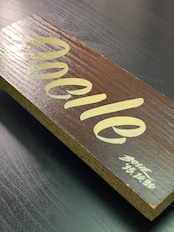 深いブラウンの木目に、象牙色で描かれた“Docile”の文字。
